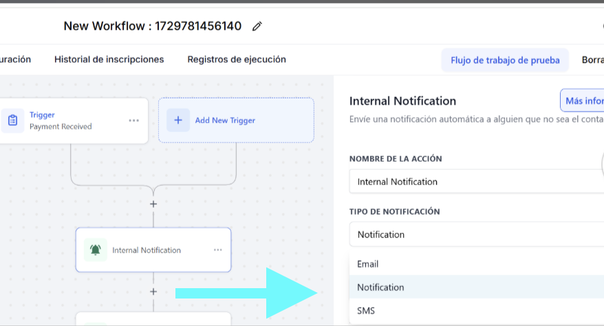 En las acciones, selecciona “Internal Notification” o similar.