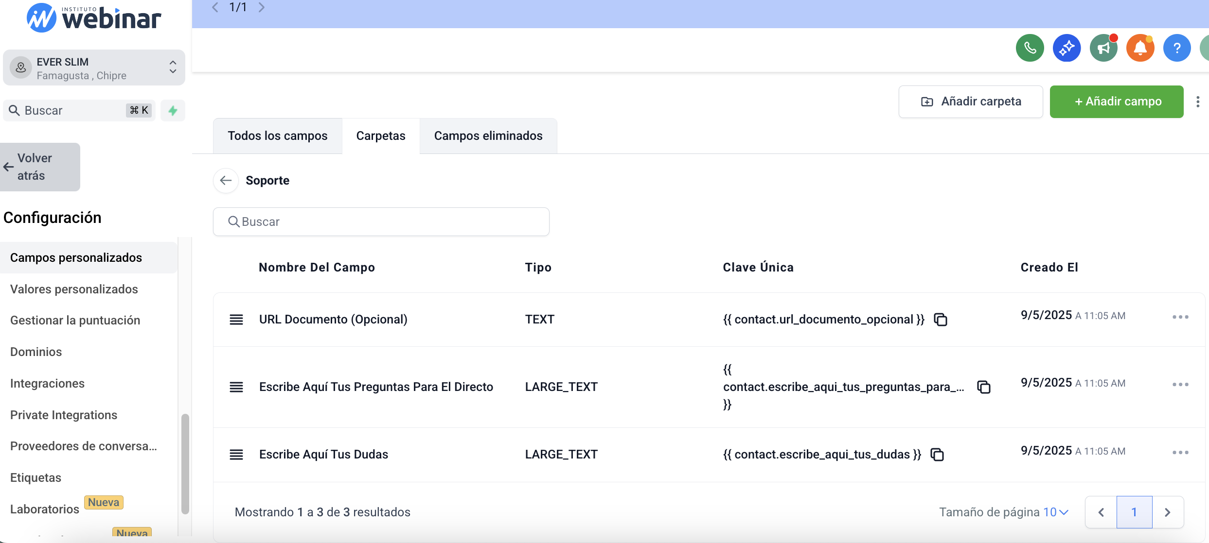 Al lado de cada "Nombre del Campo" (por ejemplo, "Escribe Aquí Tus Dudas"), verás la "Clave Única" entre dobles corchetes {{ }} (ej. {{ contact.escribe_aqui_tus_dudas }} ).