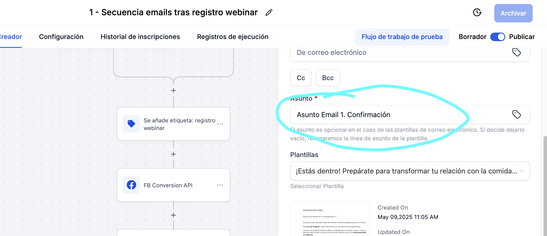 - Buscar la automatización que maneja la secuencia de emails para el registro o para la agenda de llamada.