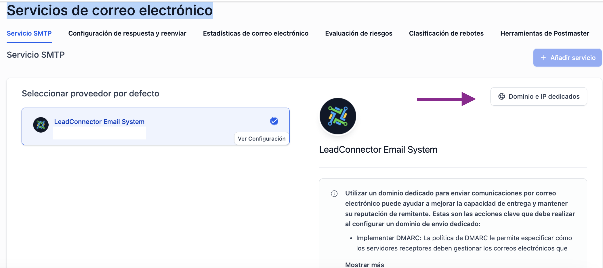 Debes ir a Kiss Flow > Configuración > Servicios de correo electrónico > Dominio e IP Dedicados